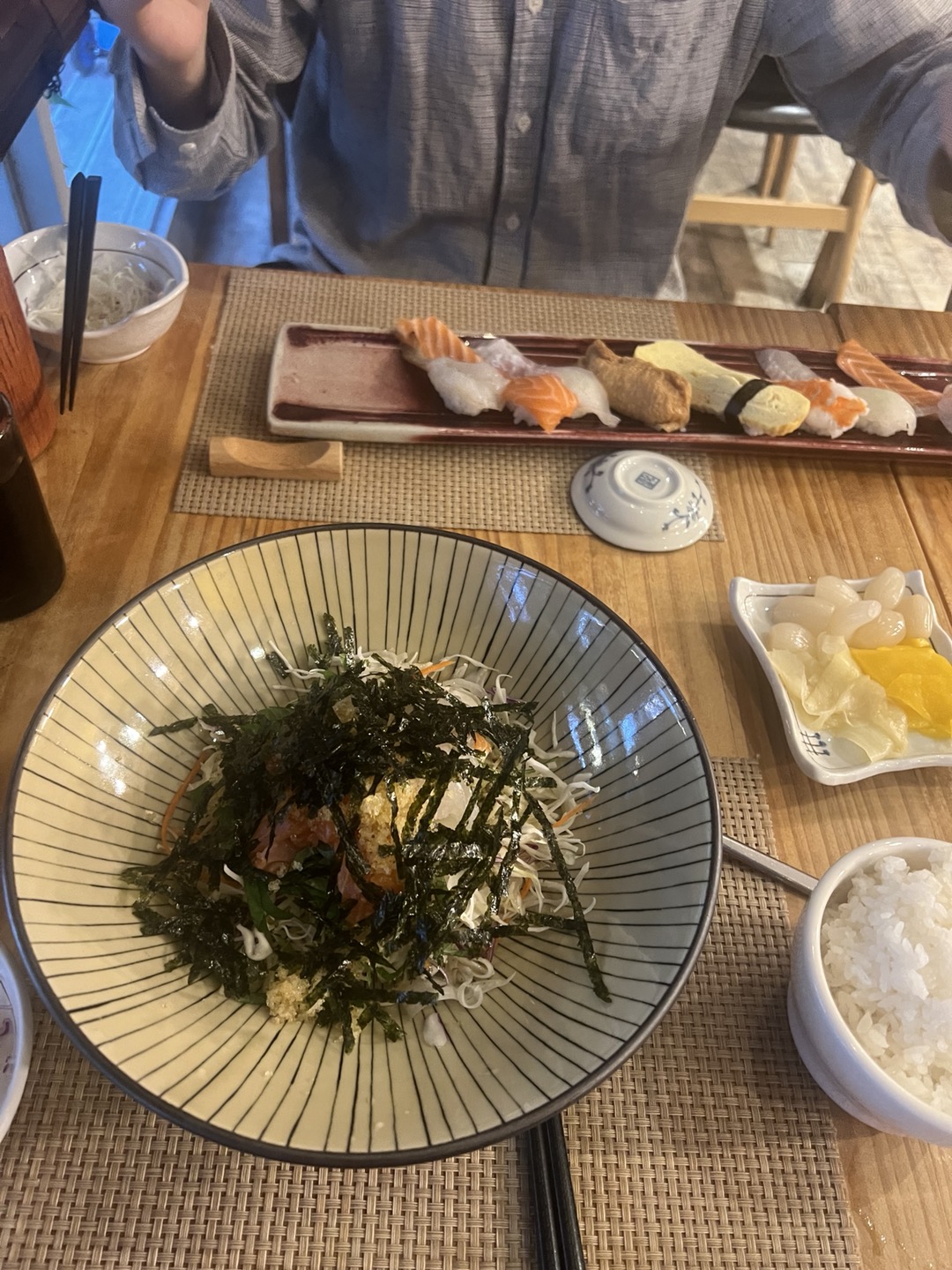 나는 2명이 가면 오늘의 초밥, 회덮밥, 고로케 거기에 미니우동을 추가해서 먹는다.